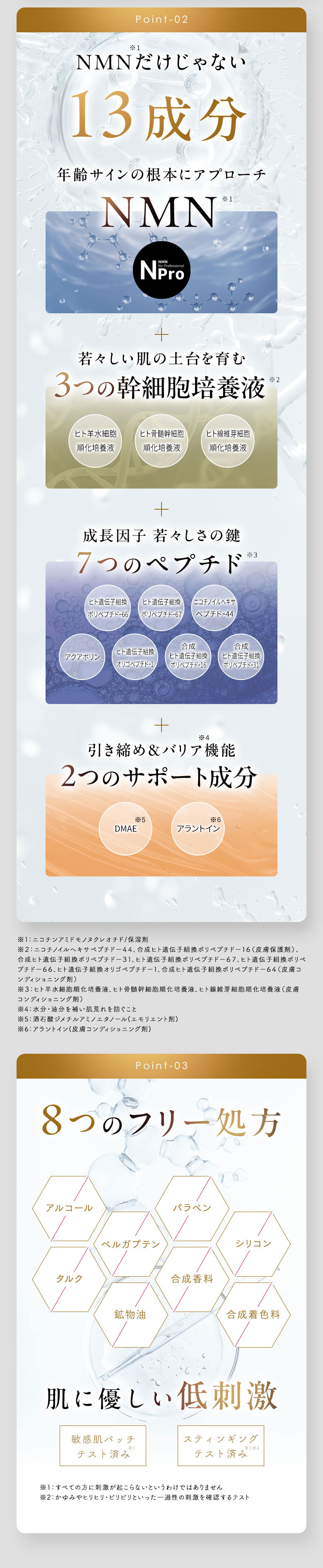 *¹・調査名:「NMN化粧品に関する調査」(TPCマーケティングリサーチ㈱調べ)・調査対象:1.「@cosme」に記載のあるNMN配合化粧品 2.「楽天市場」「Amazon」「Yahoo! ショッピング」で販売されているNMN配合化粧品 3.その他MLMチャネルで販売されているNMN配合化粧品のいずれかに該当するもの ・調査期間:2022年4月1日~20日] *²ニコチンアミドモノヌクレオチド/保湿剤 *³ヒト骨髄幹細胞順化培養液(皮膚コンディショニング剤)、ヒト線維芽細胞順化培養液(皮膚コンディショニング剤)、ヒト羊水細胞順化培養液(皮膚コンディショニング剤) *⁴ニコチノイルヘキサペプチドー44(皮膚保護剤)、合成ヒト遺伝子組換ポリペプチドー31(皮膚コンディショニング剤)、ヒト遺伝子組換ポリペプチドー67(皮膚コンディショニング剤)、ヒト遺伝子組換ポリペプチドー66(皮膚コンディショニング剤)、ヒト遺伝子組換オリゴペプチドー1(皮膚コンディショニング剤)、合成ヒト遺伝子組換ポリペプチドー64(皮膚コンディショニング剤)、合成ヒト遺伝子組換ポリペプチドー16(皮膚保護剤)