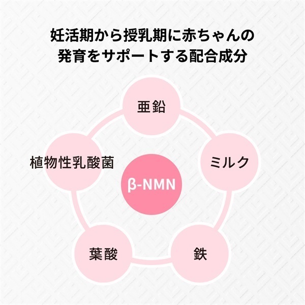 女性に嬉しい成分設計により健やかな発育と母体の健康をサポート。「葉酸」、「鉄」、「亜鉛」など、大切な妊活期~授乳期に必要な栄養素をバランスよく配合し、発育を応援します。